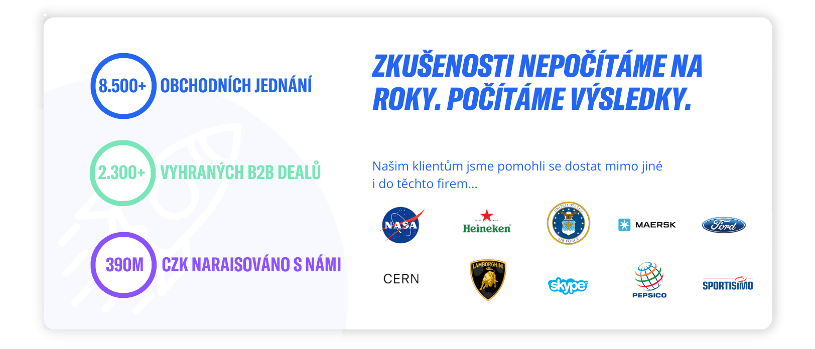 7 let úspěšně poháme startupům a rodinným firmám díky projektům, které jsme vyladili do 3-měsíčního akcelerátoru, který Vám dá přesnou GPS k násobnému růstu a škálování obchodu. Ušetřete si dva roky pokusů a chyb a získejte nástroje i schopnosti teď.